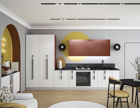 - Арочная фрезеровка фасадов кухни Арко Атриум — не просто декор, а стилистический код, в котором зашифрованы вечная красота и гармония. Её изгибы создают рельеф, в котором играет свет, а тени оживляют поверхность, превращая ее в часть живого пространства. Контрастный терракотовый верх фасадов словно напоминает о закатах над морем, а спокойный матовый низ оттеняет его, создавая баланс и глубину. Кухня становится не только зоной для приготовления еды, но и настоящей архитектурной доминантой интерьера.