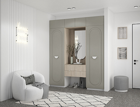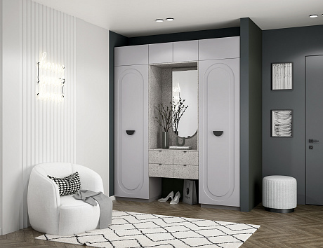 Прихожая Арко — приветствие вашего дома в фирменной эстетике линейки Арко. Два стройных пенала образуют архитектурную раму, а между ними — симметричная парящая тумба на четыре вместительных ящика.