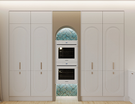 Ведущая доминанта кухни — рабочая зона с исключительно нижними модулями. Арочная фрезеровка на фасадах, направленная и вверх и вниз, придает пространству динамику. Мраморный рисунок на столешнице и фартуке отсылает к древнегреческим храмам, над ним — уложенная елочкой бирюзовая плитка. Элемент фартука? Больше. Это полноценный арт-объект.