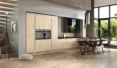 • Широкое применение плита на кухне нашла во всем мире, где ее ценят не только эстетические качества этого универсального материала, но и возможность использовать более бюджетные комплектующие при обустройстве и стилизации современных мебельных фасадов с имитацией спила натуральной древесины и шпона.