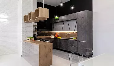 • Расширенные возможности в выборе актуального дизайна при стилизации кухонных интерьеров позволяют использовать экоплиты для оформления фасадов не только уголков и модулей, но и эффектных гарнитуров.