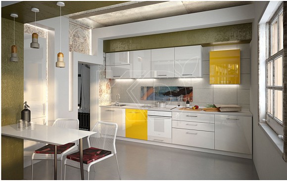Возможно несколько вариантов оформления такого гарнитура. Он может быть белоснежным, с отдельными вкраплениями желтых элементов, или делиться на два яруса разных оттенков. Обычно верхний ряд шкафов в таком случае выполняют в белом цвете, а нижний – в желтом.
