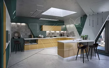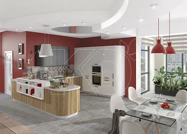 В просторных квартирах-студиях и отдельных помещениях площадью от 12 квадратных метров часто используют островные комплекты. Модули при такой планировке устанавливают вдоль одной или двух стен, в виде буквы П. Дополнительные навесные полки и шкафы часто размещают у окна.
