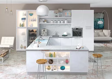 Владельцы просторных квартир и загородных домов часто прибегают к применению П-образных комплектов. Благодаря этому обеспечивается несколько рабочих зон и большое количество места для посуды, бытовой техники.