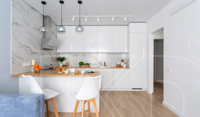 Выбирая расцветку, предпочтение отдайте светлым оттенкам. Белые кухни визуально расширят помещение, сделают его более светлым и просторным. К тому же белоснежные фасады привлекательно смотрятся, не выходят из моды и легко интегрируются в любой интерьер. В белом выполняют модели в разных стилях – сканди, лофт, модерн и неоклассика.