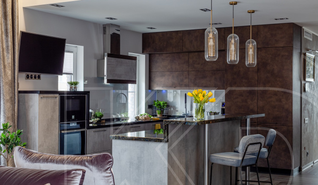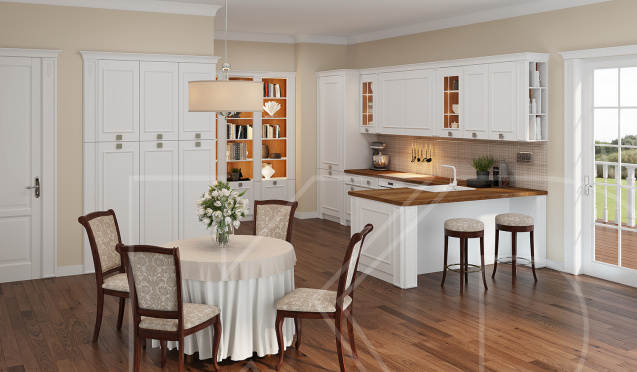 За основу дизайнеры взяли ниши, перегородки и совмещенные территории. Кухни классика – основа стиля, на которую можно посмотреть с другой стороны таким образом: середина кухонного помещения освобождена, гарнитур установлен в виде «перевертыша» (боком) у стены.