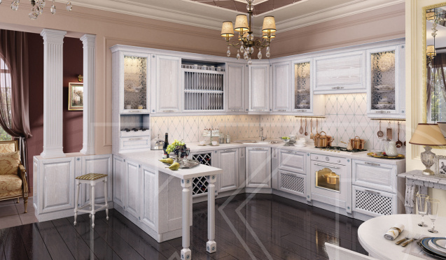 Главное в концепции кухни неоклассика – это огороженная зона, которая не видна при входе в кухню. Да, это необычно и стильно, но дизайн такого помещения требует грамотного расположения всех модулей, техники и предметов интерьера.