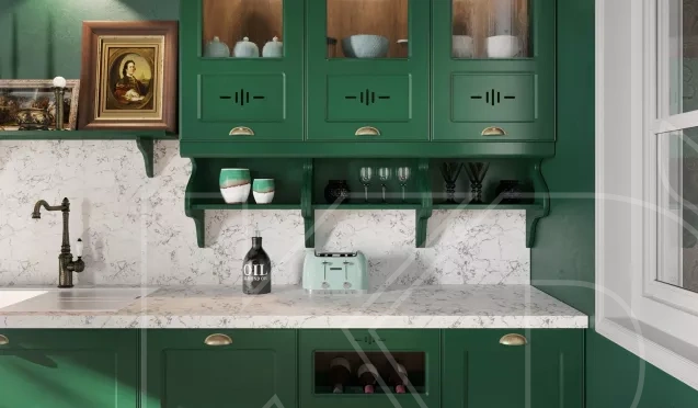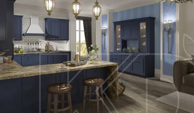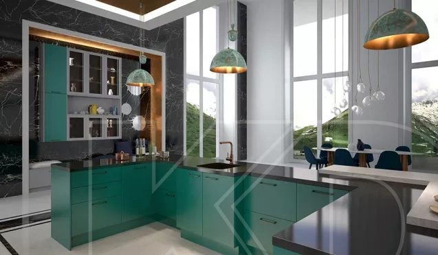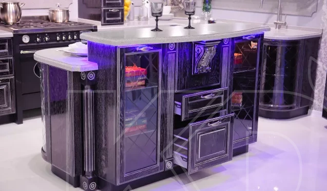 Широкая палитра. Подобные кухонные гарнитуры выполняют в черных, коричневых, графитовых, бордовых, малахитовых, темно-синих тонах.