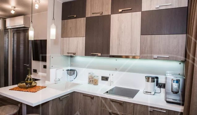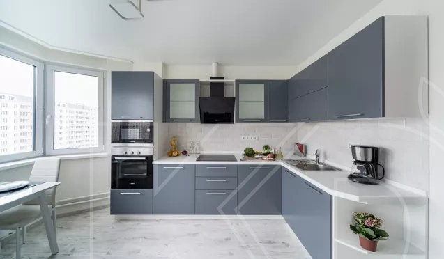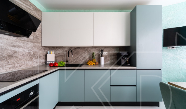 Угловая планировка часто используется в средних по размеру комнатах. Благодаря расположению модулей у двух смежных стен, в угол можно встроить раковину и шкаф для посуды.