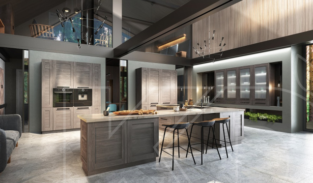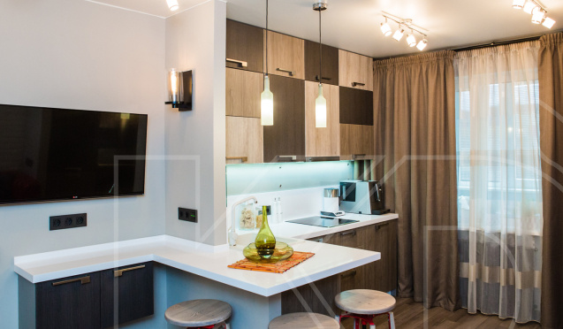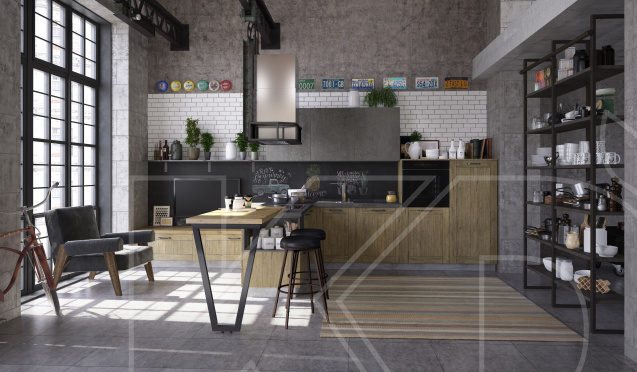 Для просторной квартиры-студии лучше выбрать модель побольше. Подходящими считаются островные кухни в темных цветах. Как правило, они используются для зонирования пространства.