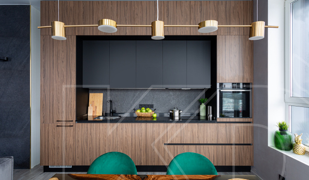 Кухонный гарнитур с темными поверхностями будет выигрышно смотреться только с хорошим освещением. В противном случае он перегрузит и затенит пространство. Поэтому для рабочей поверхности следует продумать дополнительное освещение. Благодаря ему проще создать уютную атмосферу, подчеркнуть красоту текстур.