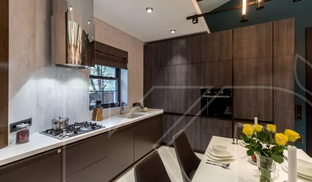 Коричневые кухни в темных тонах можно дополнить столешницей песочного, кремового или фисташкового оттенка. Для монохромного дизайна можно использовать поверхность в тон или немного светлее.
