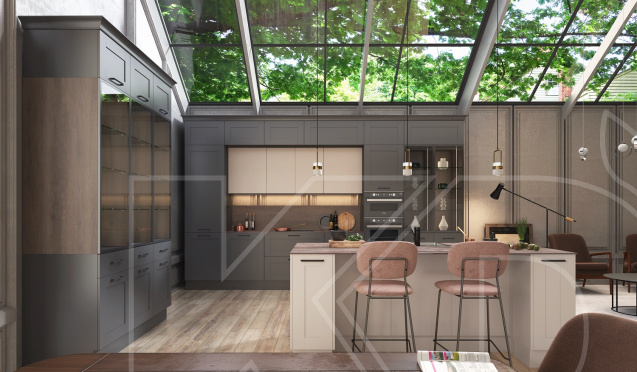 Графитовая модель смотрится мягче черной, но это не лишает ее благородства и стиля. Подобная кухня темных цветов в полной мере раскрывается в комбинации с пастельными оттенками.